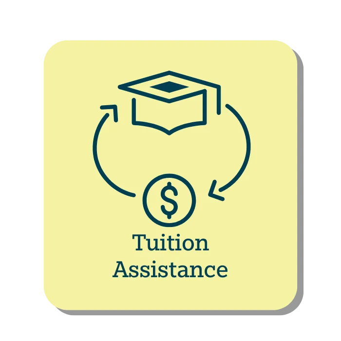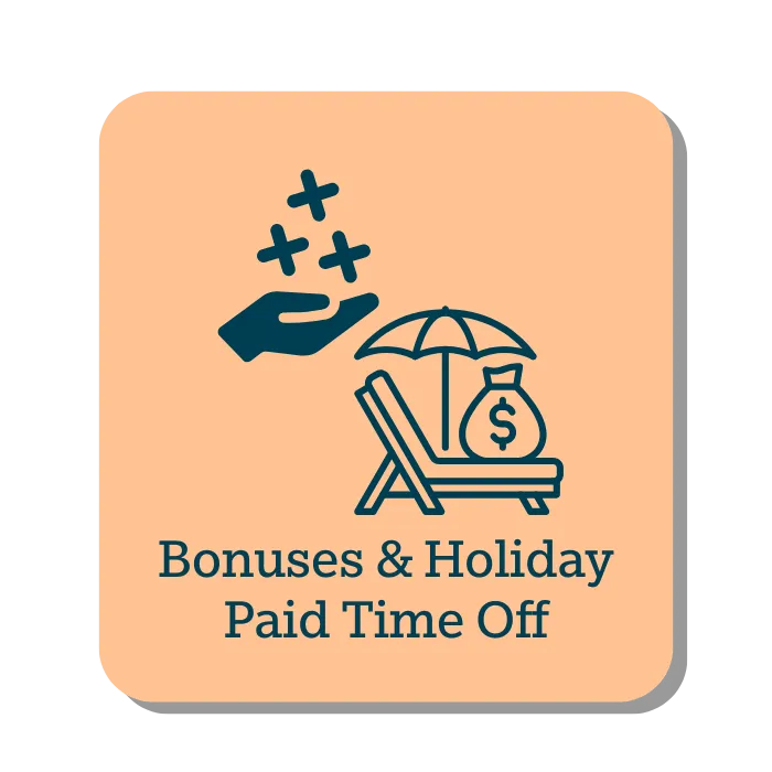 Free parking 🚗, uniforms, discounts on childcare and memberships 🎟️, bonuses 💰, holiday paid time off, family and medical leave 👨👩👧👦, paid training 📚, tuition assistance 🎓, career progression 📈, and fun team celebrations 🎉